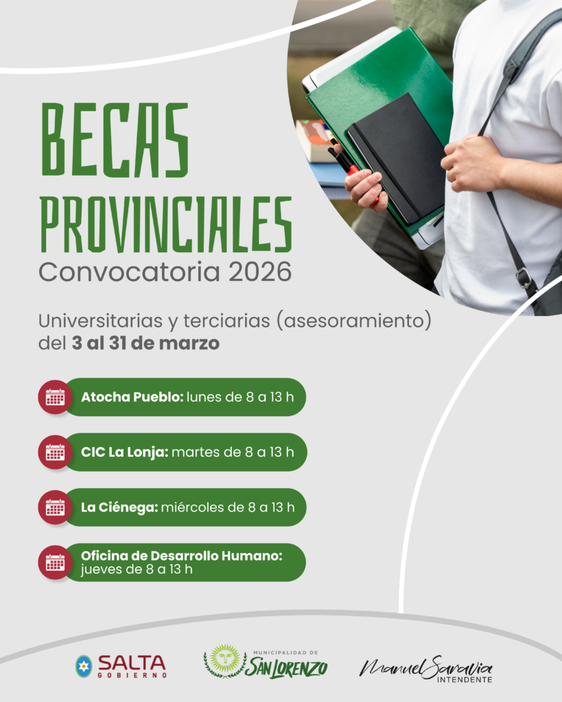 La Municipalidad de San Lorenzo informa que hasta el próximo 31 de marzo se encontrarán abiertas las inscripciones y las renovaciones para las becas destinadas a jóvenes estudiantes de toda la provincia de Salta que se encuentren estudiando carreras de nivel superior universitarias y terciarias tanto en instituciones públicas como privadas.
