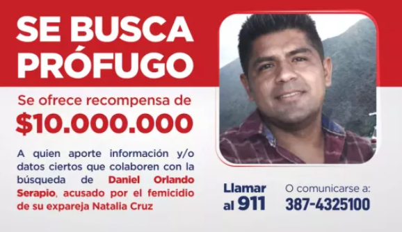 El Gobierno de Salta, a través del Ministerio de Gobierno y Justicia, dispuso de una recompensa de $10.000.000 (diez millones de pesos) para aquellas personas que aporten información o datos ciertos que permitan dar con el paradero de Daniel Orlando Serapio, señalado como presunto autor del homicidio de Natalia Marilin Cruz, ocurrido el 17 de febrero de 2026.